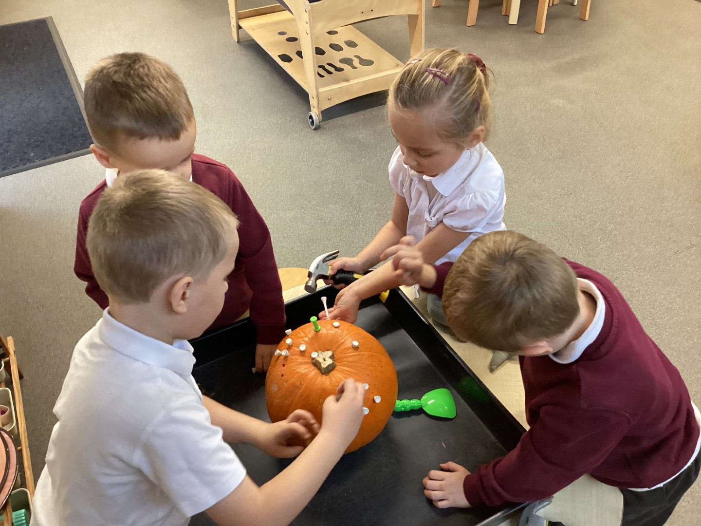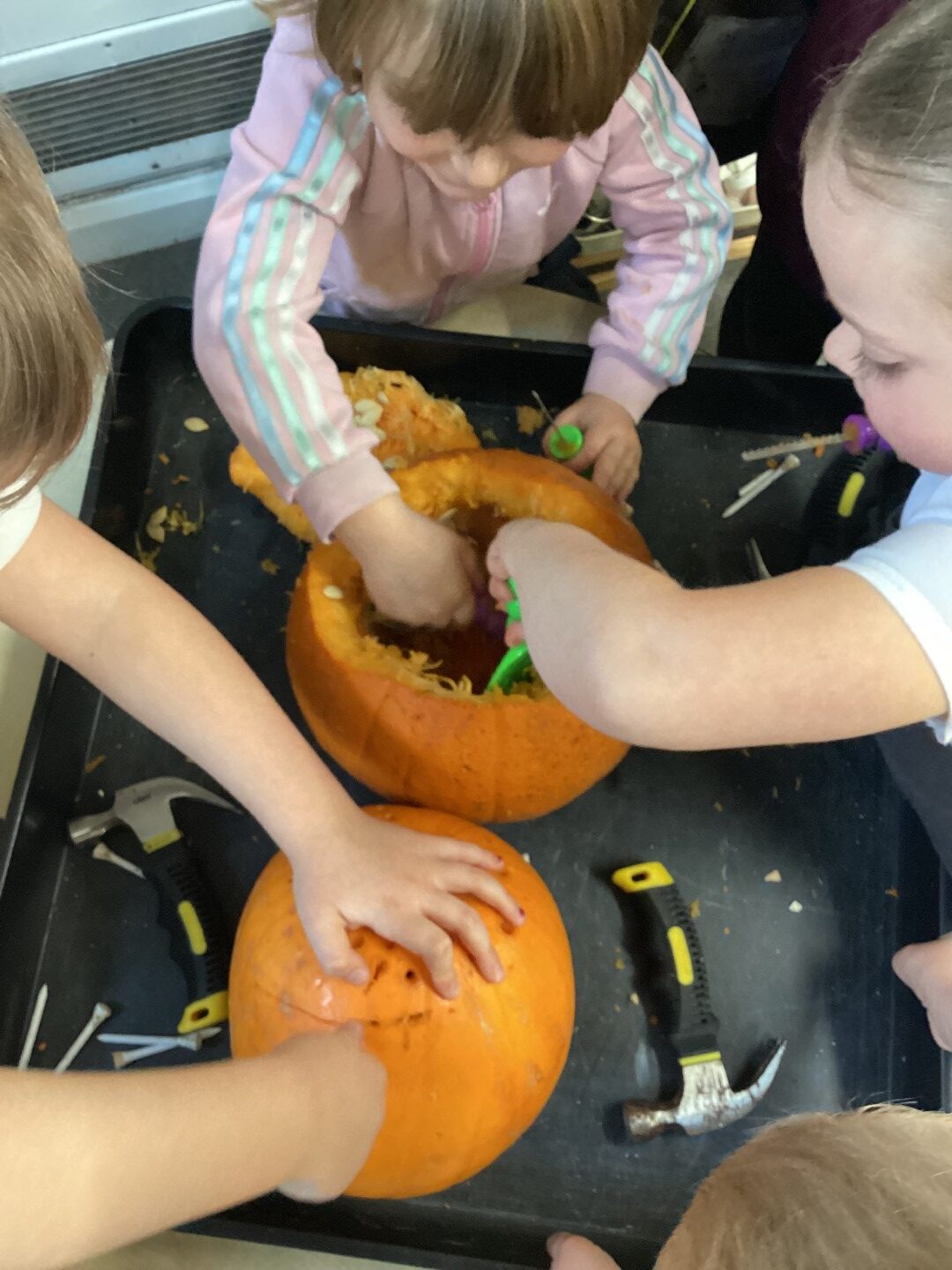 The celebrations continued with some hands-on fun! We made delicious edible sparklers and experimented with drawing bright, twinkling fireworks using sand and chalks. Our fine motor skills got a boost too, as we carefully used hammers, golf tees, and carving tools to transform pumpkins into festive creations.